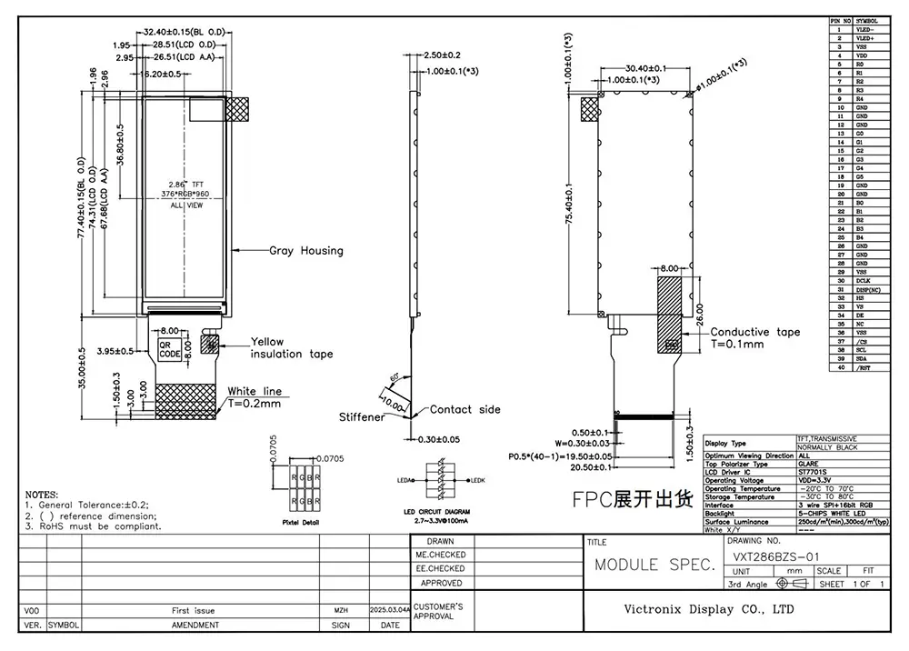 در عصر هوش ، ماژول TFT ما را قادر می سازد تا داده های مورد نیاز را به صورت بصری ارائه دهیم. کیفیت ماژول TFT تأثیر اساسی در کاربرد آن دارد. مزایای ماژول TFT TFT Victronix 2.86 اینچ 376 × 960 IPS چیست؟ در ابتدا ، روشنایی 300 CD/m² آن ، نسبت کنتراست 1500: 1 ، زاویه مشاهده 85 درجه در همه جهات و یکنواختی 80 ٪ تصاویر واضح را تضمین می کند. ثانیاً ، از رابط SPI+16bit RGB با ST7701S پشتیبانی می کند ، و یک نور پس زمینه سفید LED با 5 می توانید با طول عمر 30،000 تا 50،000 ساعت ، از قابلیت استفاده بلند مدت آن در کاربردهای مختلف صنعتی اطمینان حاصل کند. علاوه بر این ، مطابق با استانداردهای ROHS است و با موفقیت تست های قابلیت اطمینان دقیق ، از جمله شوک حرارتی ، رطوبت و محافظت ESD را تا 8 کیلو ولت هوا و تماس 4KV می گذراند. این محصول در دماهای شدید از -20 درجه سانتیگراد تا +70 درجه سانتیگراد کارآمد است و می تواند در برابر شرایط ذخیره شدید از -30 درجه سانتیگراد تا +80 درجه سانتیگراد مقاومت کند.